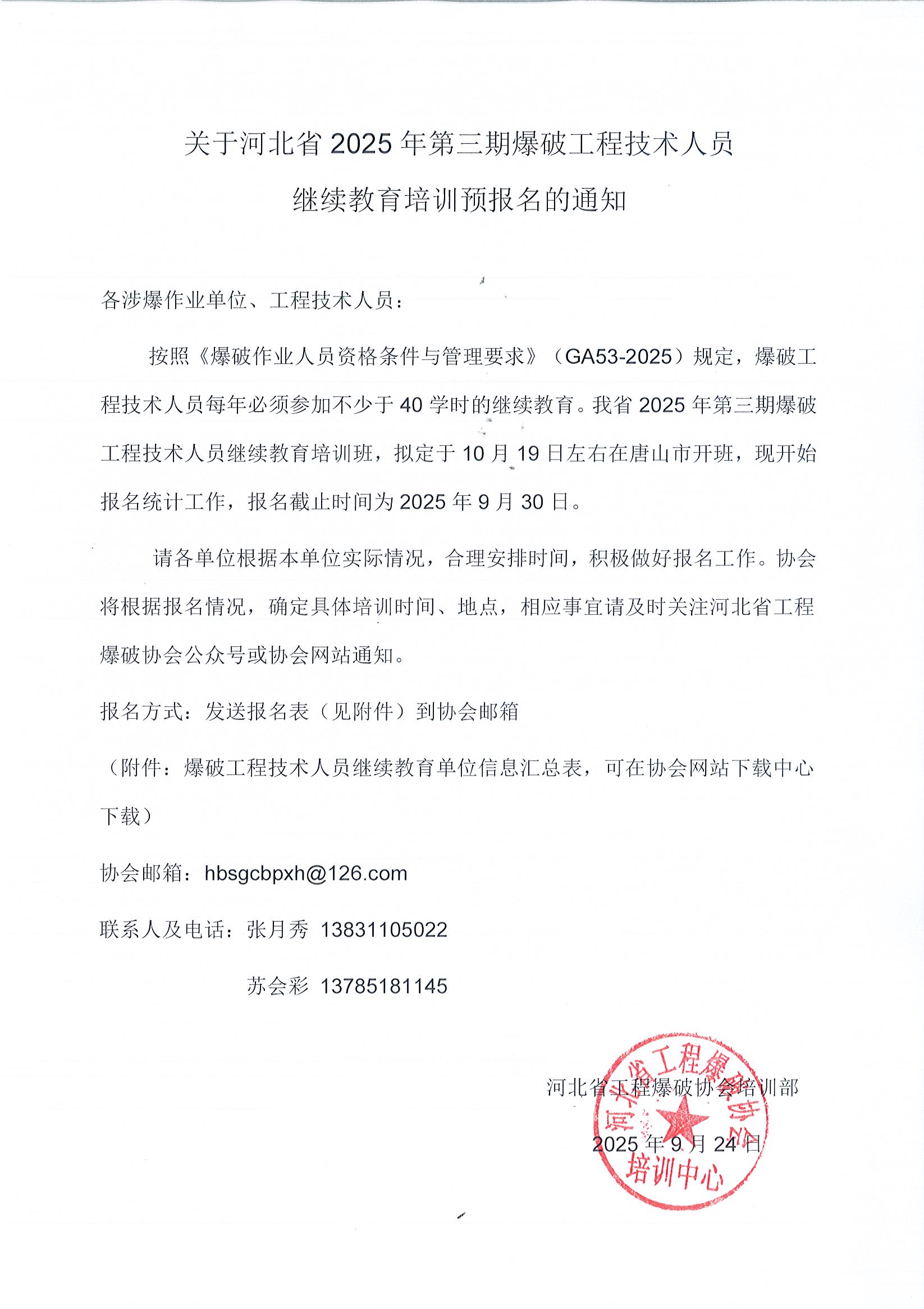 上一篇: 关于举办2025年度河北省爆破工程技术人员继续教育培训班(第二期)的通知