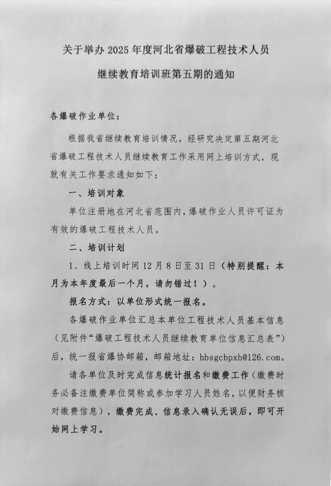 关于举办2025年度河北省爆破工程技术人员继续教育培训班第五期的通知